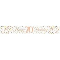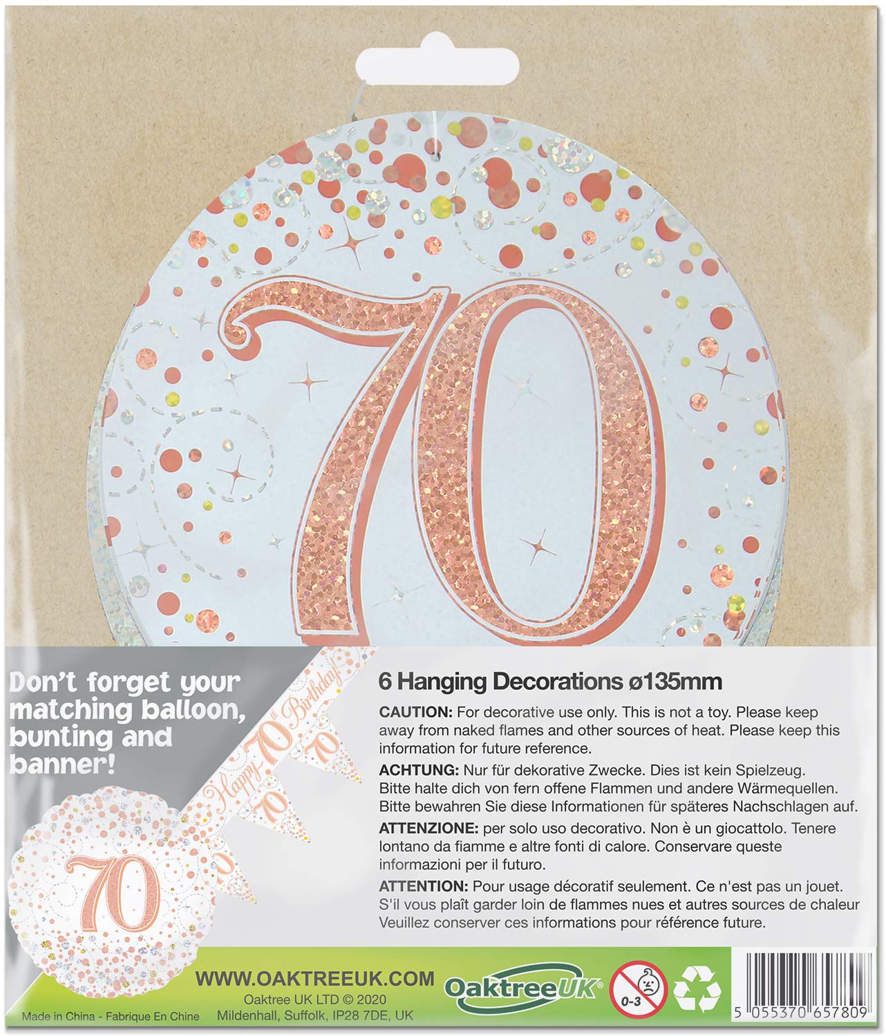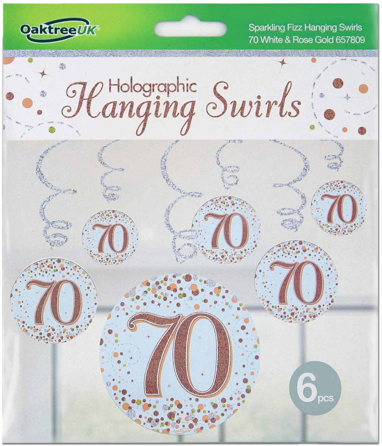 Suchst du die perfekte Deko für eine 70. Geburtstagsfeier? Dann sind diese OakTree Sparkling Fizz Hängewirbel genau das Richtige! Im Set sind 6 Stück enthalten, die jeweils eine Länge von 81 cm haben. Sie sind in einem eleganten Weiß und Rotgold gehalten und tragen die holografische Aufschrift '70'. Mit den praktischen Aufhängeschlaufen kannst du sie super einfach an der Decke, an Wänden oder über dem Buffet aufhängen – sie entfalten dann ihre volle Wirkung und bringen glamouröses Party-Feeling in den Raum. Perfekt kombinierbar mit anderen OakTree Roségold-Artikeln wie Bannern, Wimpelketten oder Folienballons für ein stimmiges Gesamtbild. Ob im Wohnzimmer, im Partykeller oder im Festzelt – diese Hängewirbel sind ein echter Hingucker und sorgen für strahlende Augen beim Jubilar und den Gästen. Einfach aufhängen und die Feier kann beginnen!