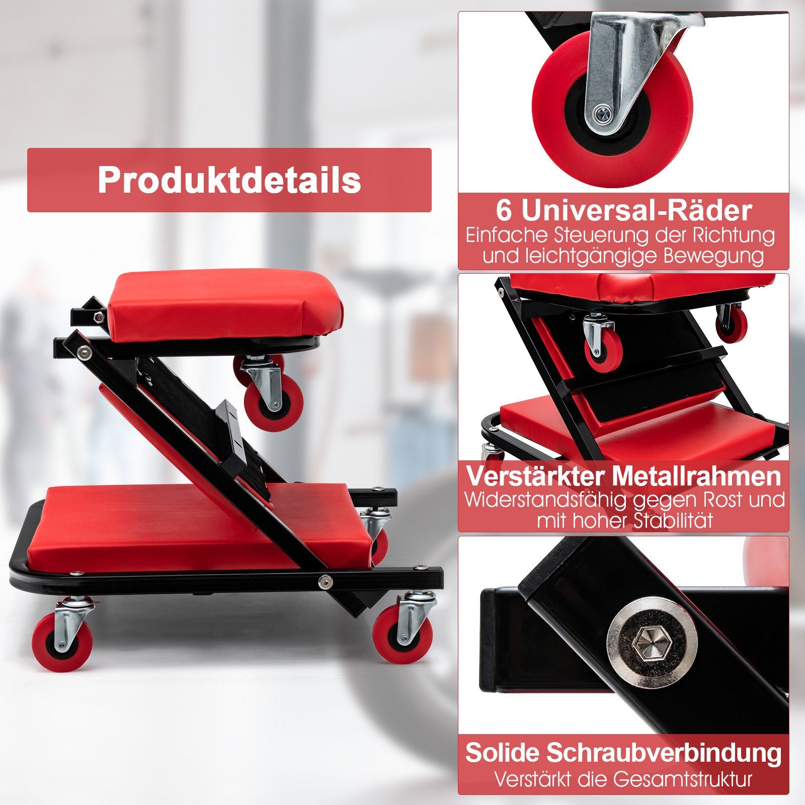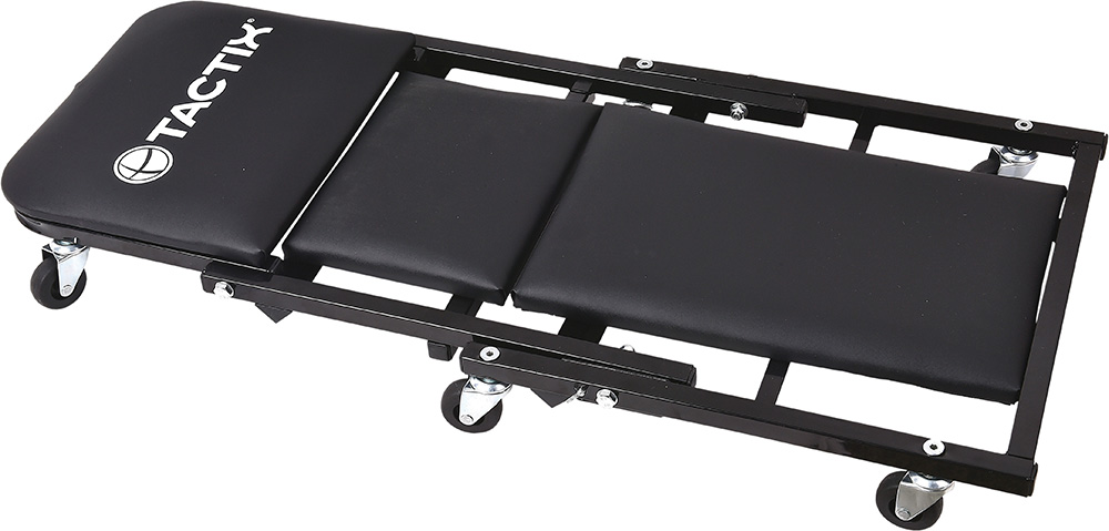 Das Gestell besteht aus pulverbeschichtetem Stahlrohr und trägt problemlos bis zu 125 kg. Die Polsterung ist mit Kunstleder bezogen und sorgt für angenehmen Liegekomfort. Besonders praktisch: Die Liege hat 7 Rollen mit Lenklagern, sodass du sie leicht unter das Auto schieben und positionieren kannst. So musst du dich nicht mühsam robbend fortbewegen.